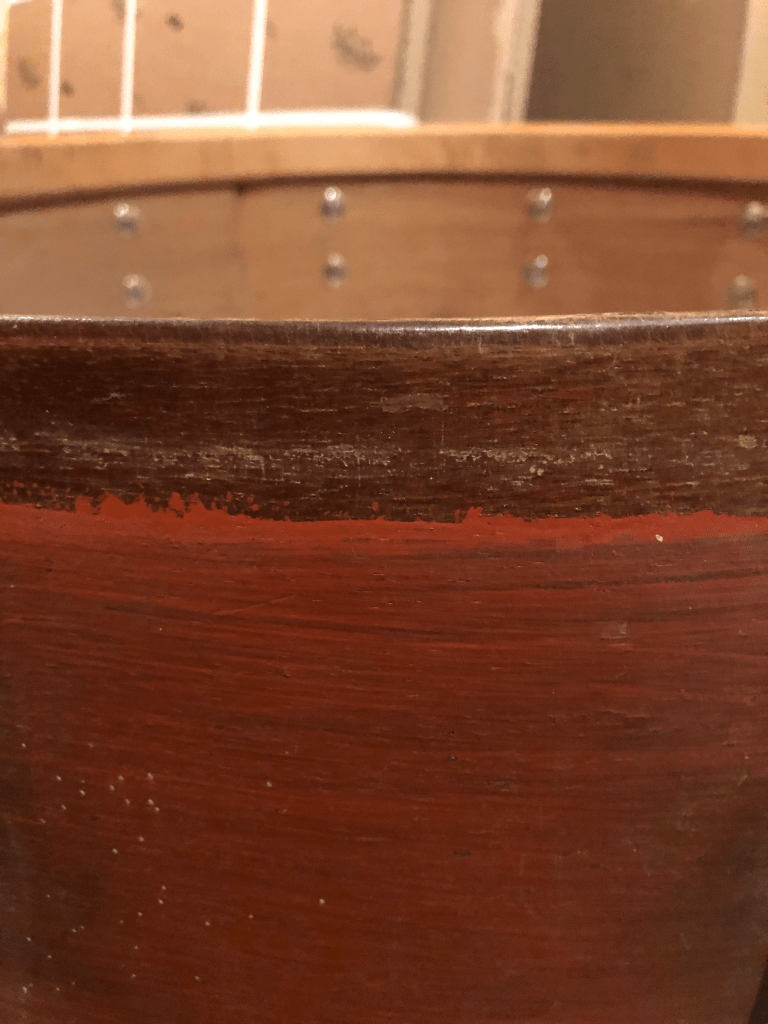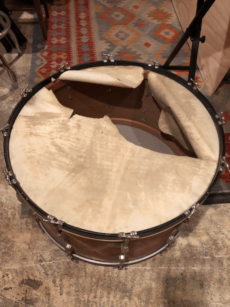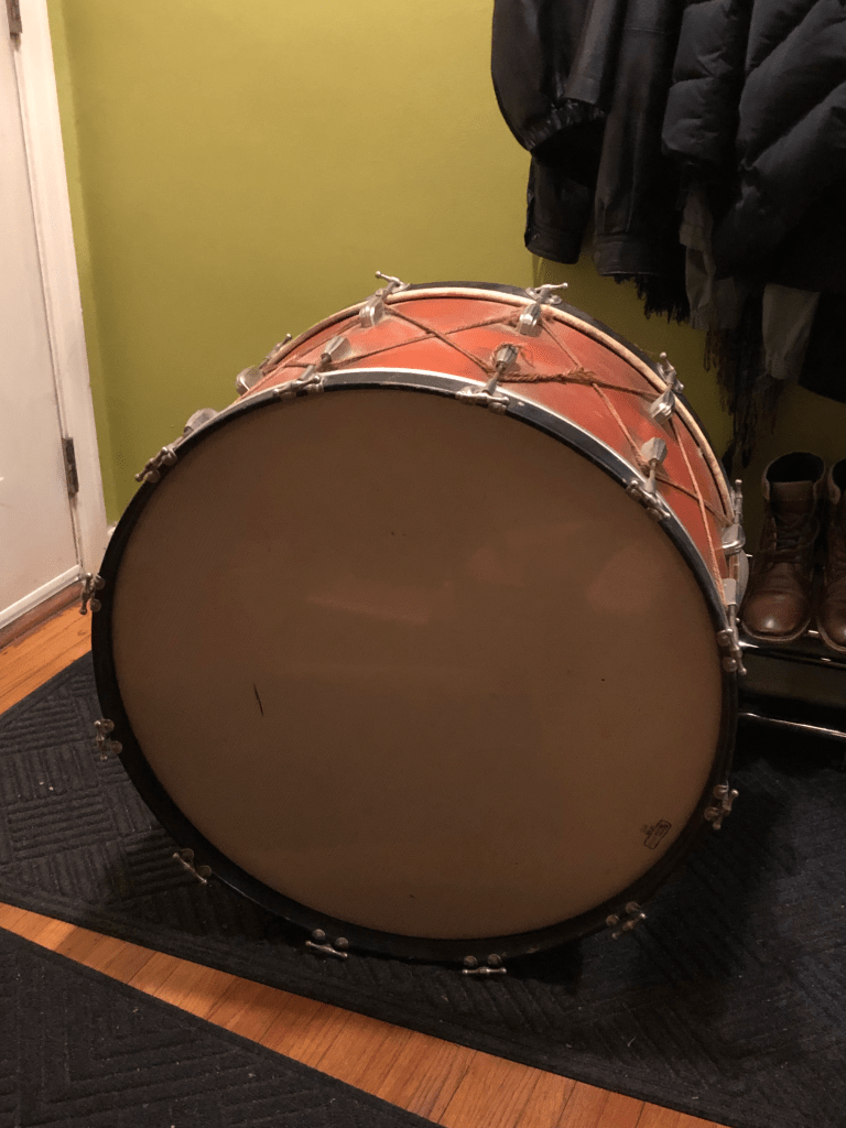 Sometimes it just happens this way… browsing the internet (or social media) and in the midst of being fed previous search queries, a diamond in the rough pops up. Crudely marketed to the broadest of audiences, sometimes the product titles do not even include the word “drum”. But there it was, in all its grime and glory, painted over and unintentionally obscured by orange and rope, the magical relic of a bygone era when drum manufacturing was a hand craft, resonating deeply in the post-war market. Zooming in for details like badge markers and lug/tension rod design, there were moments of trepidation unfolding in my mind: “Should I really strike out and drive all the way to Tipton, IA to find out if this one-of-a-kind piece is really what I imagine it to be? What if the depressingly torn calfskin head is just a larger indicator of a sad fate that unfolded in the hands of neglectful owners?” Ultimately, I conjured up the courage to careen down the highway in the deepest dark of an early Iowa winter evening, cash in hand and prayers that it does not turn out to be a lemon.