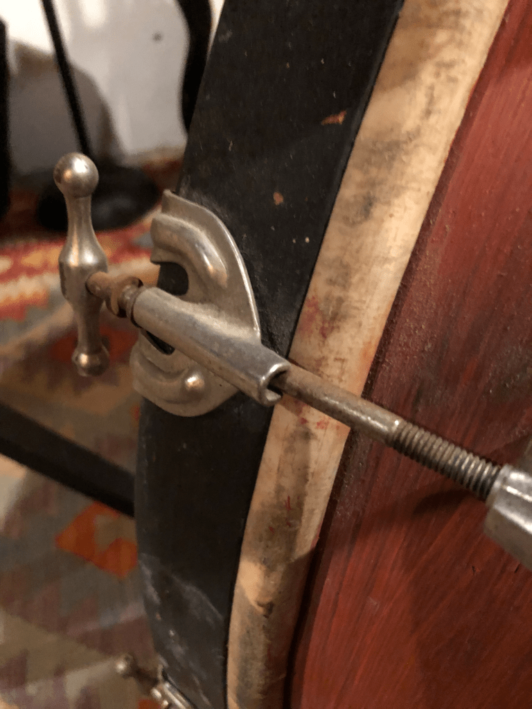Slipping into parallel parking at a little after 9pm, the turn-of-the-century craftsman style house was already a welcome indicator as to the vintage of this drum. I casually ambled up the path and steps to greet the owner and in a very warm and welcoming manner, he invited me into the front room to view the drum. On closer inspection, the tension rods and lugs were definitely either early or mid-20th century, despite their encrusted rust, and grimy muted metal plating. “They don’t make them like they used to…” I may have blurted out, or was it just the thought passing through my fatigued mind. With some hemming and hawing, I outstretched my hand with a crisp fifty dollar bill and the deal was done. Carrying it off to my van, I opened up the latch on the trunk and grabbed my flashlight. Lo and behold, the badge, obscured by deep, rusty orange paint, read: “Slingerland, Chicago, ILL.” The excitement churned up from the bottom of my belly. I hopped into the driver’s seat and took off into the night, exhilarated by the “find” and already scheming about ways to restore this relic to its former glory.